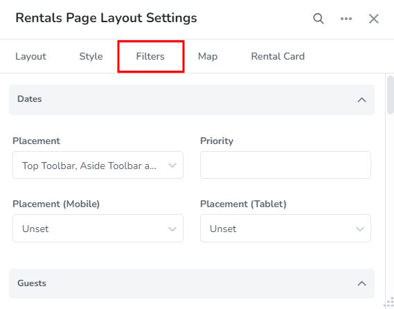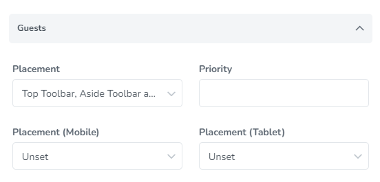 Set the areas where the guests filter should be placed and the priority to determine the order that the field should appear.