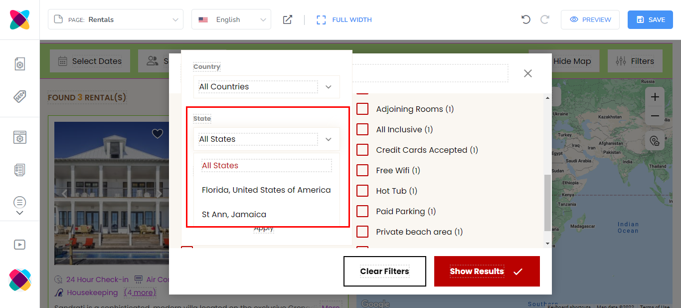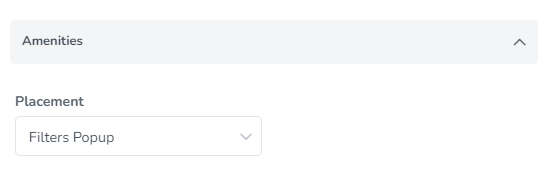 Placement: This option lets you choose the area where the amenities filter will be displayed. The options are Filters popup or Hidden.