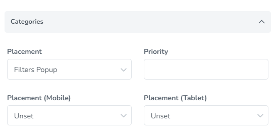 Set the areas where the categories filter should be placed and the priority to determine the order that the field should appear.