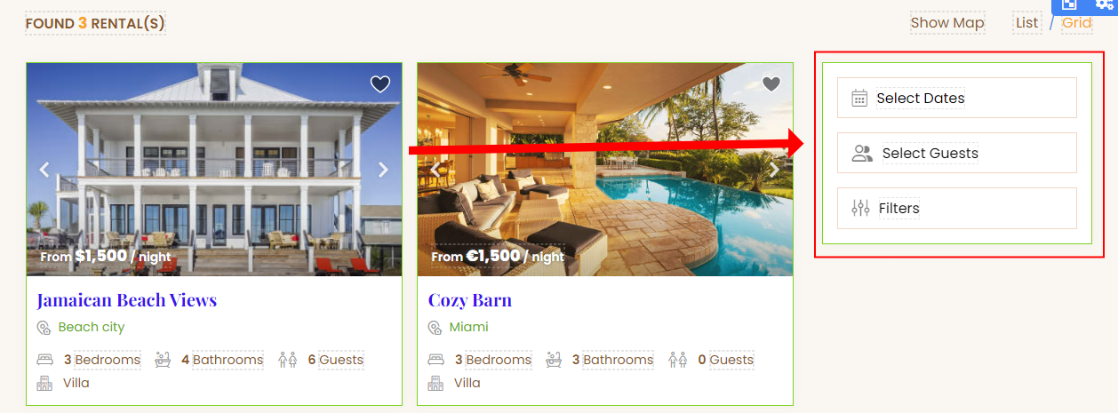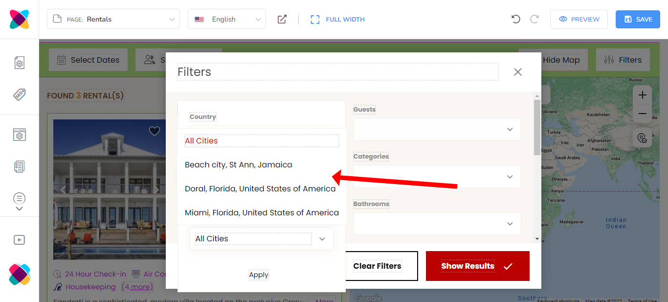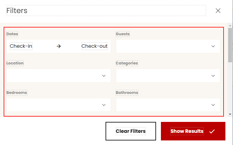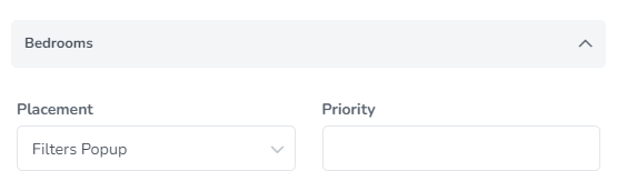 Placement: This option lets you choose the area where the bedrooms filter will be displayed. The options are Filters popup or Hidden.