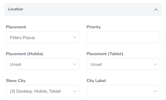 Set the areas where the location filter should be placed and the priority to determine the order that the field should appear.