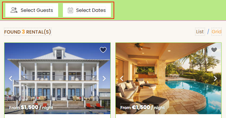 Top Toolbar area showing the Dates and Guests filter options: