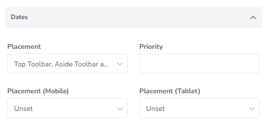 Set the areas where the date filter should be placed and the priority to determine the order that the field should appear.